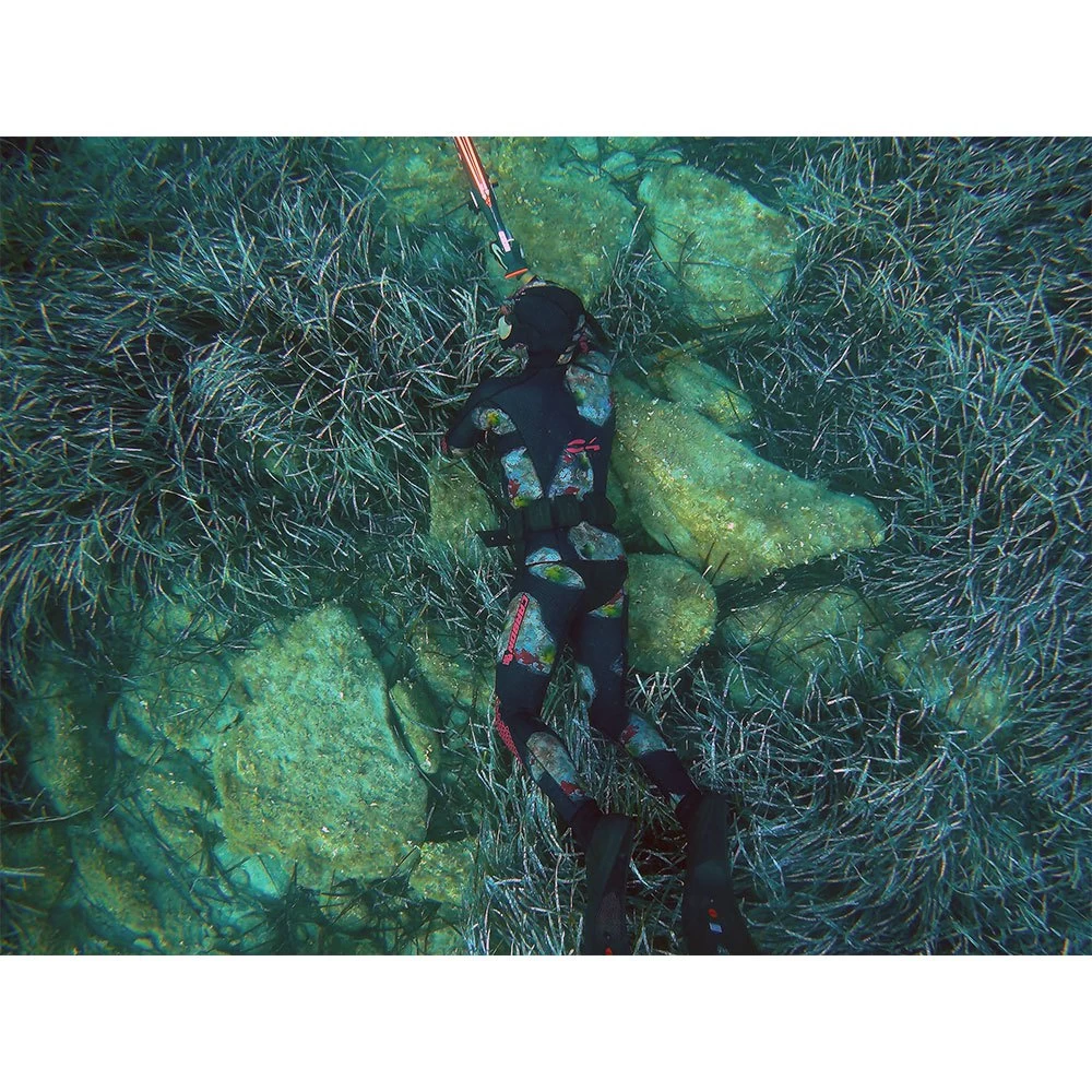 The exclusive design of this wetsuit features a background in carbon fiber color with spots of 3D camouflaged sea bottom.