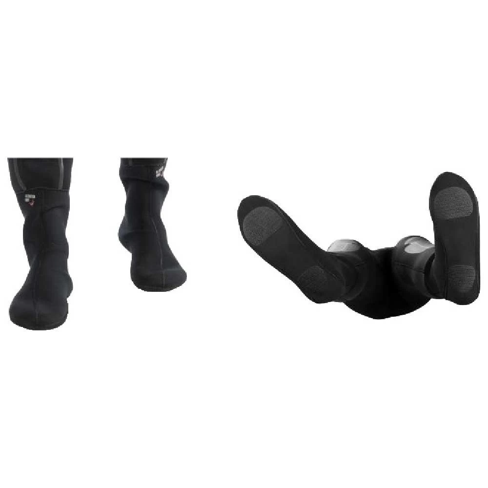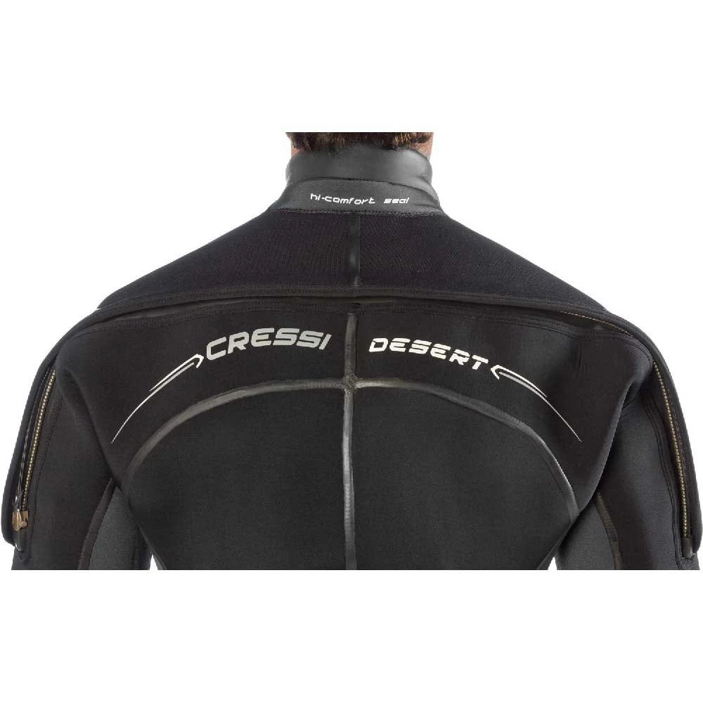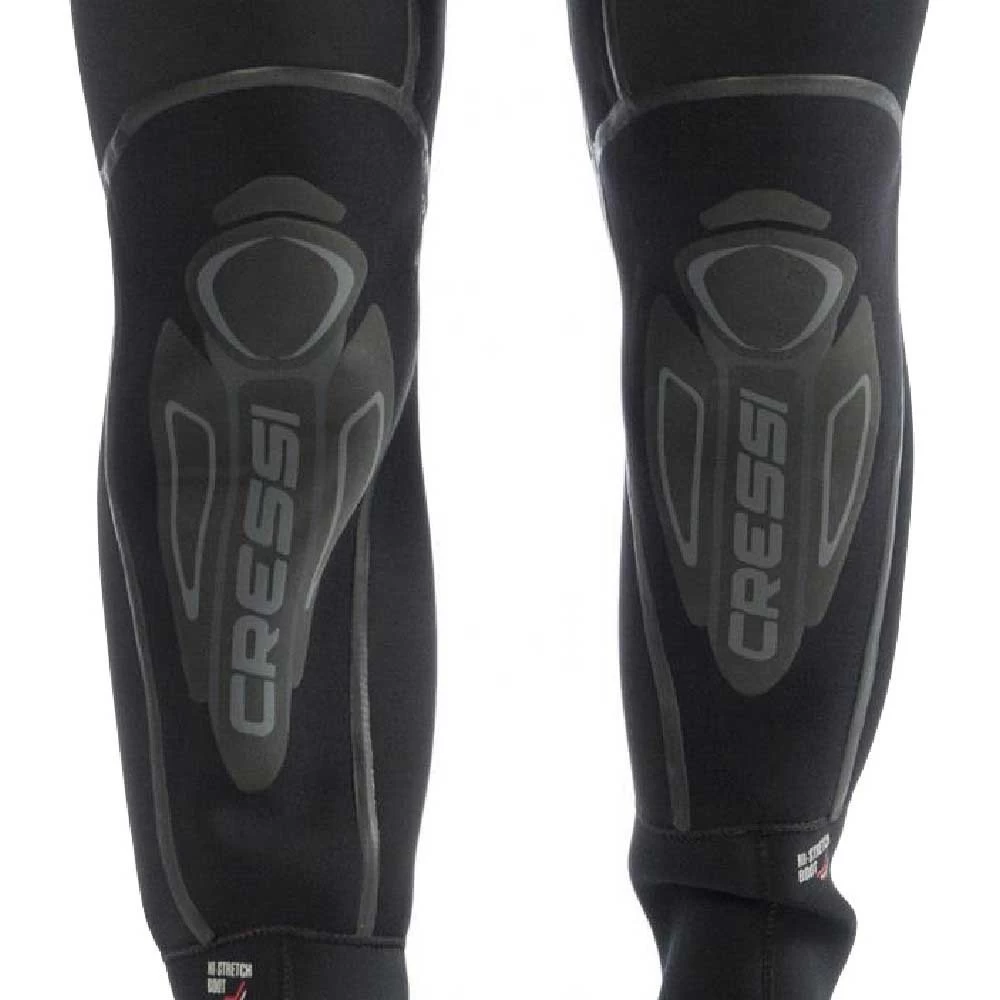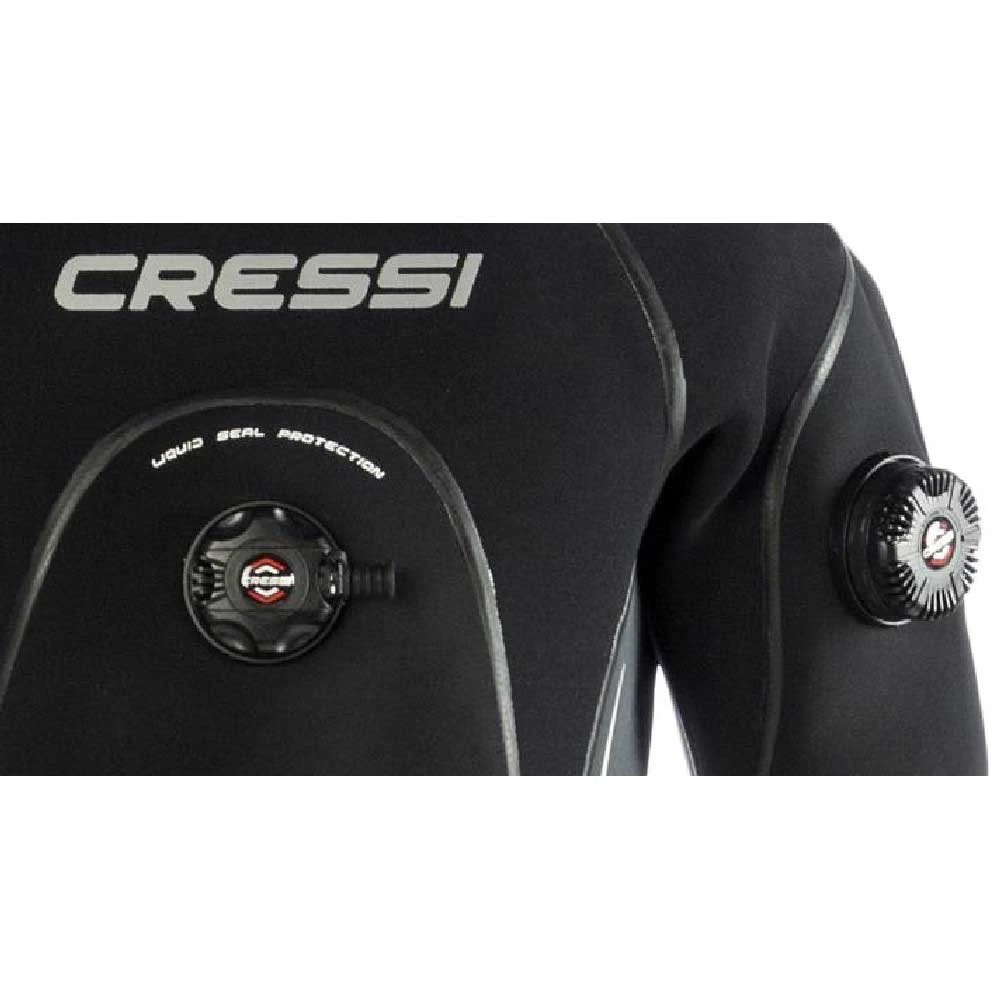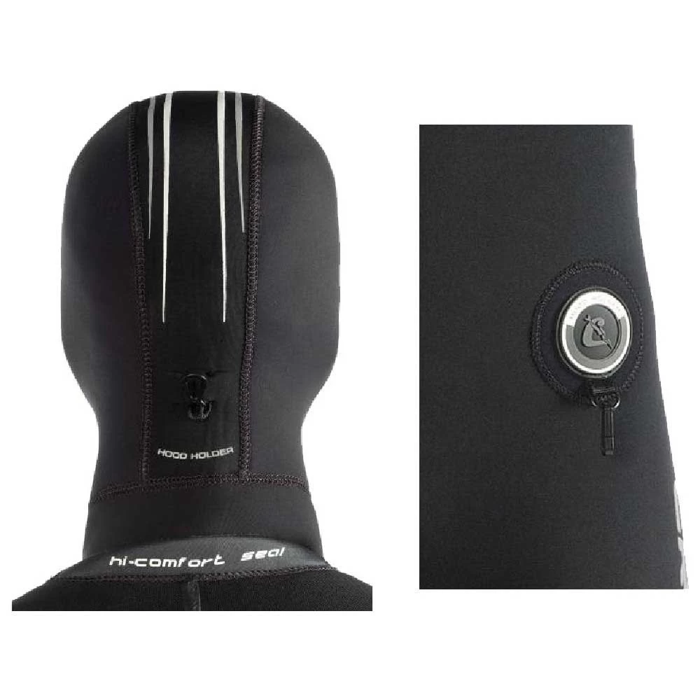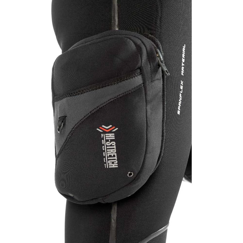 Comfortable and resistant thanks to its 4mm thick High Density pre-compressed neoprene dry suit and Liquid Seal protected stitched joints. The seams and outer neoprene lining are covered with a special layer of elastomer so as to simultaneously create an impermeable obstacle for the water and increased resistance at the joints. On the inside, an additional sealing strip guarantees total waterproof-ability. This double sealing system has been carefully designed to meet the needs of the most discerning and seasoned divers that often require their dry suits to be able to adapt to extreme working or weather conditions. The special Span flex material has also been used in the outer part so as to increase elasticity and abrasion resistance. The cuffs are made of smooth 3,5 mm-thick neoprene on the inside in order to improve sealability and from Ultra span on the outside in order to improve elasticity. The collar is made of the same materials but with 2,5mm-thick neoprene for more comfort and breathability when turned-up. The shoulder neck and knee lines are reinforced with a special anti-abrasion X-Diamond Pad lining. The suit comes with a practical multipurpose pocket placed on the right leg as well as a comfortable hood.