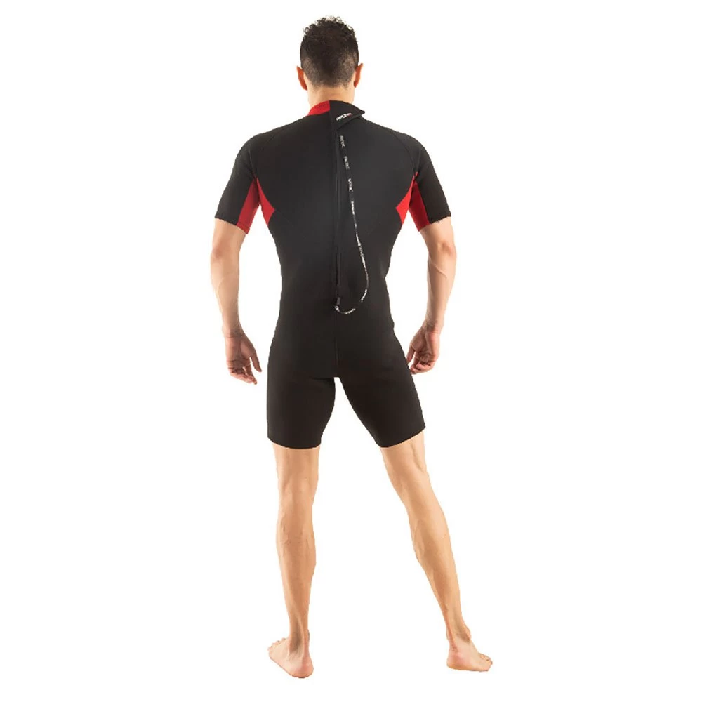One-piece shorty with rear zip in 2.2-mm double-lined neoprene. Preformed cut for the perfect suit for water sports like surfing, snorkeling,