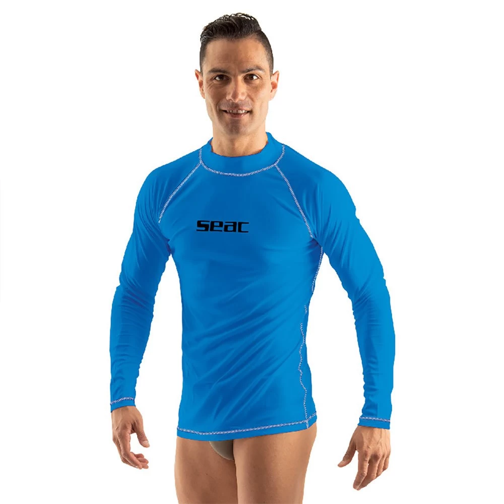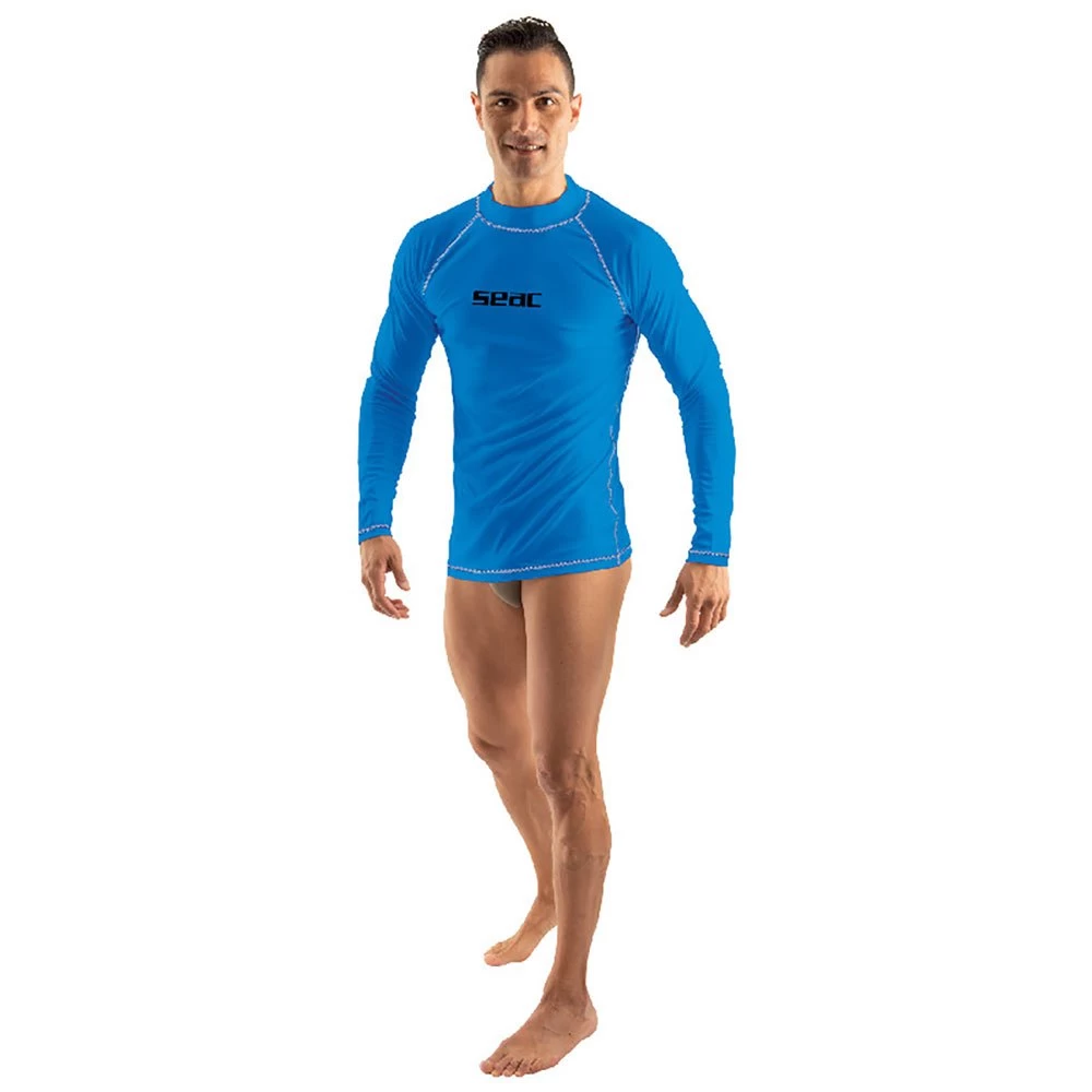 The Seac T-Sun long sleeved rash guard T-shirt fully protects the torso and arms from abrasion caused by equipment rubbing, rocky seabeds or contact with jellyfish and other stinging creatures.